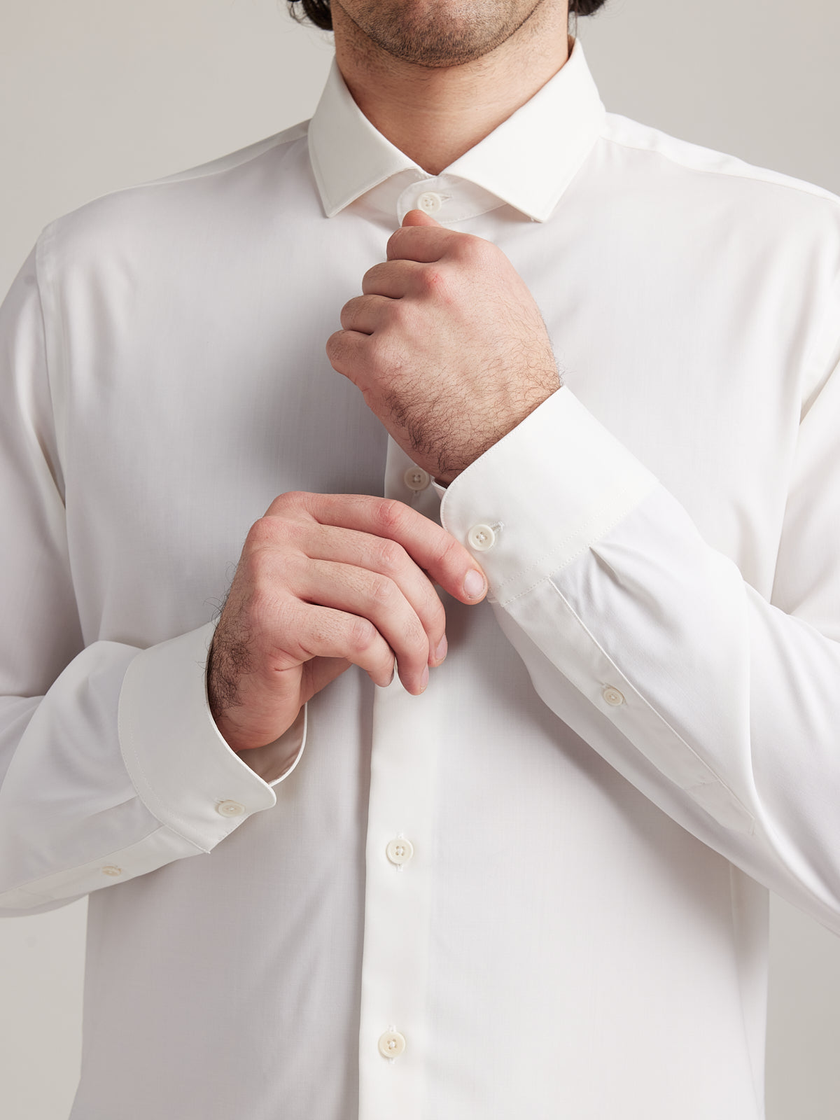 Le tissu en laine mérinos superfine est exceptionnellement doux et haut de gamme. Nos experts italiens utilisent une technologie de filage compact innovante pour tisser l'étoffe la plus lisse imaginable. La surface est parfaitement nette, sans aucun aspect pelucheux, offrant un toucher plus lisse qu'une chemise en coton.