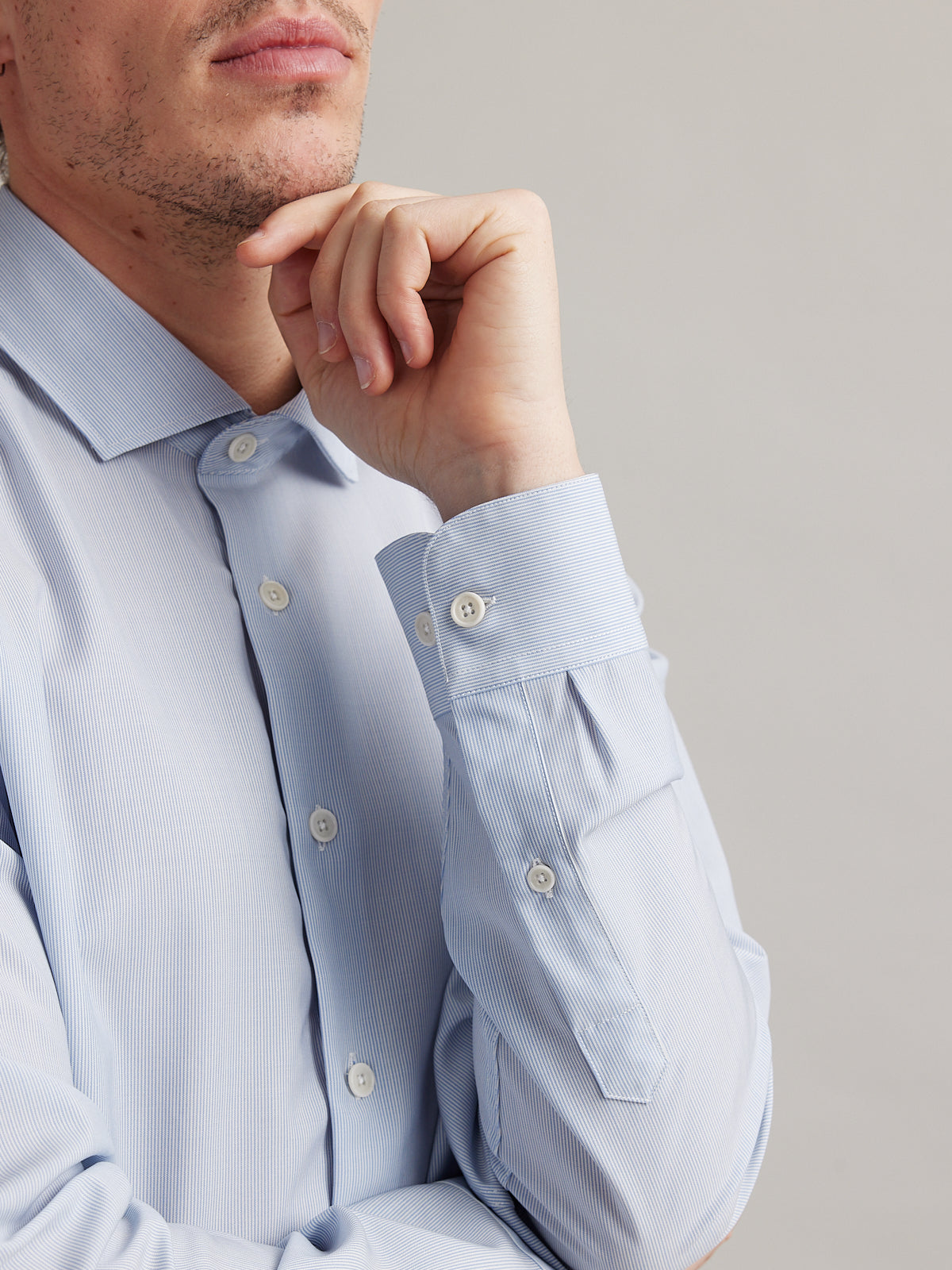 Le tissu en laine mérinos superfine est exceptionnellement doux et haut de gamme. Nos experts italiens utilisent une technologie de filage compact innovante pour tisser l'étoffe la plus lisse imaginable. La surface est parfaitement nette, sans aucun aspect pelucheux, offrant un toucher plus lisse qu'une chemise en coton.